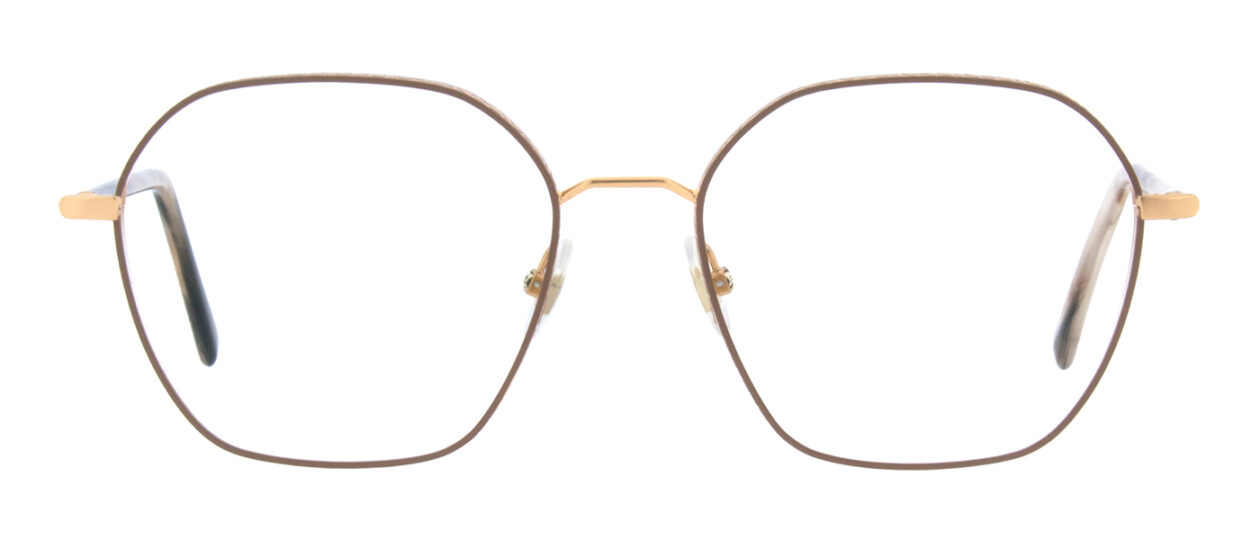 Explore our medium-sized metal frame with thicker wire and intricate custom patterning. Featuring an angular nose bridge, feminine geometric design, and joyful color combinations.